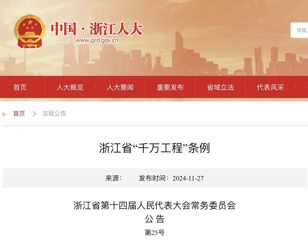 《浙江省“千萬工程”條例》已于2024年11月27日經(jīng)浙江省第十四屆人民代表大會常務(wù)委員會第十三次會議通過,現(xiàn)予公布,自2025年1月1日起施行?! ≌憬∪?.....