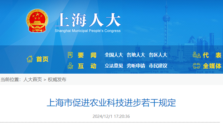 上海市人民代表大會常務(wù)委員會公告《上海市促進(jìn)農(nóng)業(yè)科技進(jìn)步若干規(guī)定》已由上海市第十六屆人民代表大會常務(wù)委員會第十七次會議于2024年11月28日修訂通過,現(xiàn)予公布......