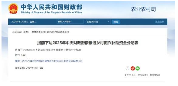 近日,財政部提前下達(dá)2025年中央財政銜接推進(jìn)鄉(xiāng)村振興補助資金,全國資金規(guī)模共計1593億元。銜接推進(jìn)鄉(xiāng)村振興補助資金是中央及地方財政為了支持鄉(xiāng)村振興而設(shè)立的一......