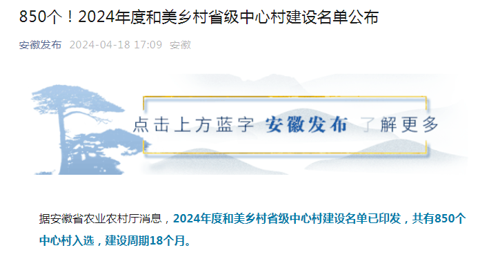 2024年度安徽省和美鄉(xiāng)村省級(jí)中心村建設(shè)名單已印發(fā),共有850個(gè)中心村入選,建設(shè)周期18個(gè)月。加快建設(shè)彰顯徽風(fēng)皖韻的宜居宜業(yè)和美鄉(xiāng)村,是推進(jìn)安徽農(nóng)業(yè)農(nóng)村現(xiàn)代化的......