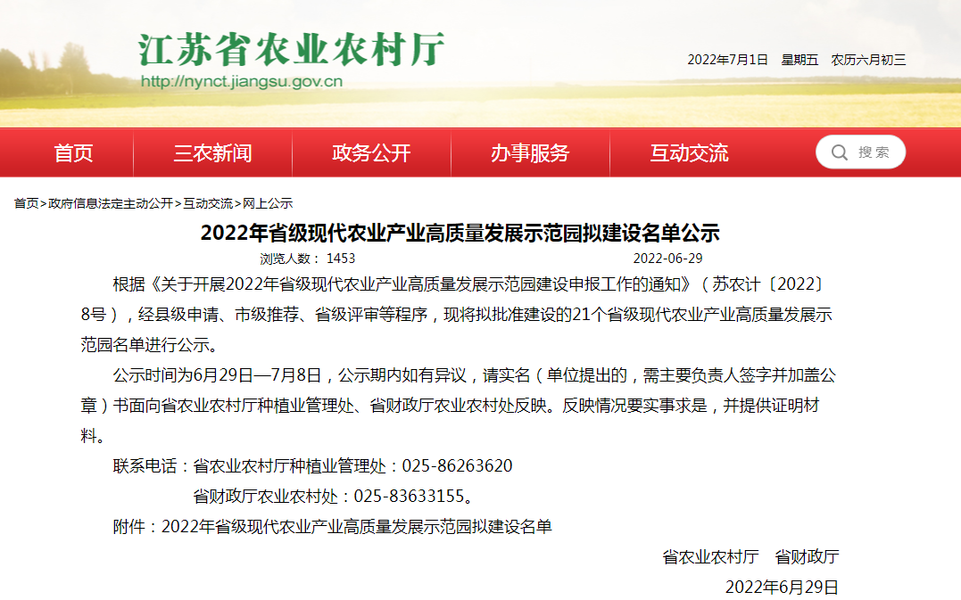 根據(jù)《關(guān)于開展2022年省級現(xiàn)代農(nóng)業(yè)產(chǎn)業(yè)高質(zhì)量發(fā)展示范園建設(shè)申報(bào)工作的通知》(蘇農(nóng)計(jì)〔2022〕8號),經(jīng)縣級申請、市級推薦、省級評審等程序,現(xiàn)將擬批準(zhǔn)建設(shè)的2......