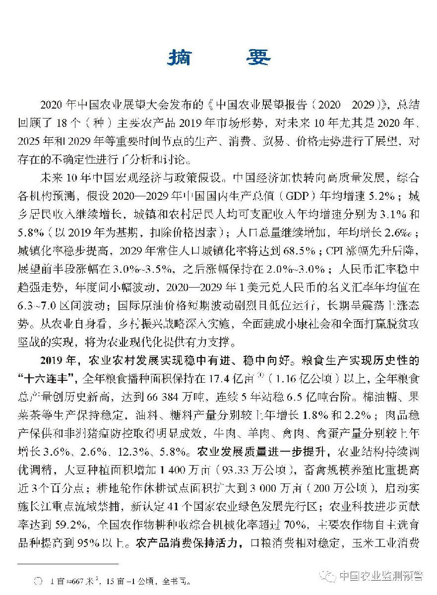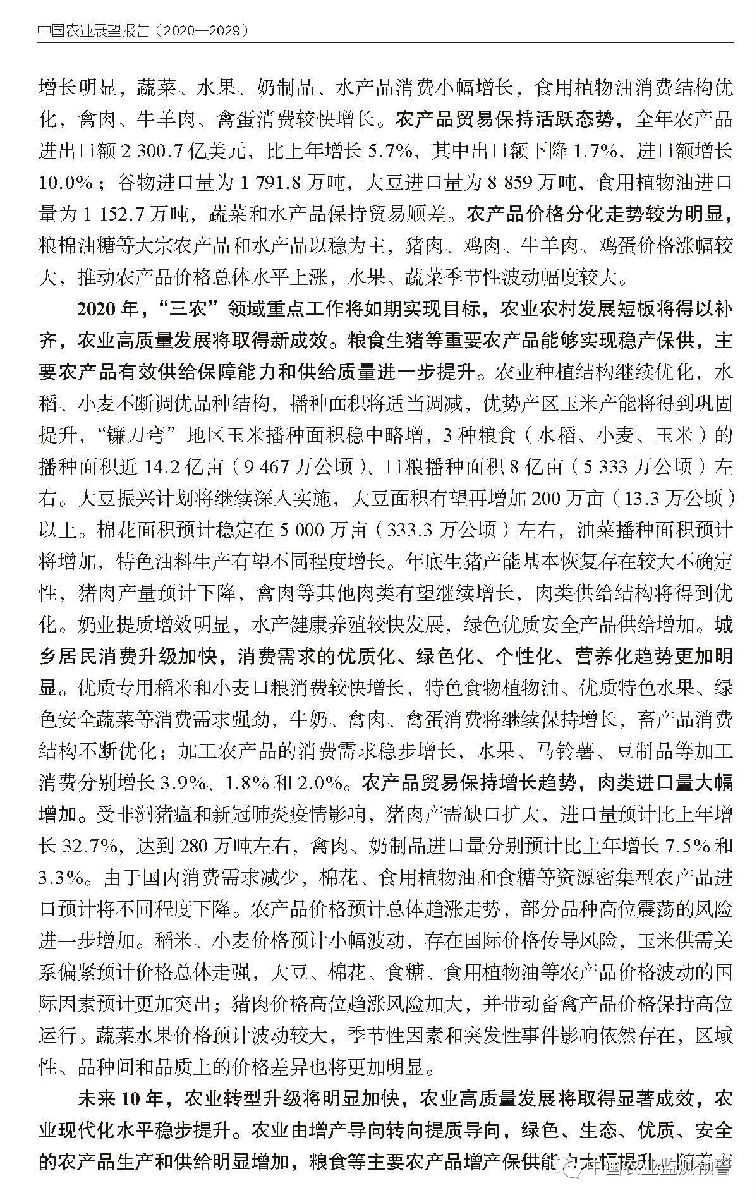 “未來10年,我國稻谷產(chǎn)量穩(wěn)定在2億噸以上,年均增長0.6%,小麥產(chǎn)量年均增長0.13%,玉米產(chǎn)量年均增長2.5%,綠色、生態(tài)、優(yōu)質(zhì)、安全的農(nóng)產(chǎn)品生產(chǎn)和供給明顯增加……”4月20日發(fā)布的《中國農(nóng)業(yè)展望報告(2020-2029)》(以下簡稱《報告》)中,一系列由農(nóng)業(yè)農(nóng)村部市場預警專家委員會預測研判的權(quán)威數(shù)據(jù),勾勒出我國未來10年糧食生產(chǎn)將穩(wěn)中有增、提質(zhì)調(diào)優(yōu)、增產(chǎn)保供能力大幅提升的總趨勢。
