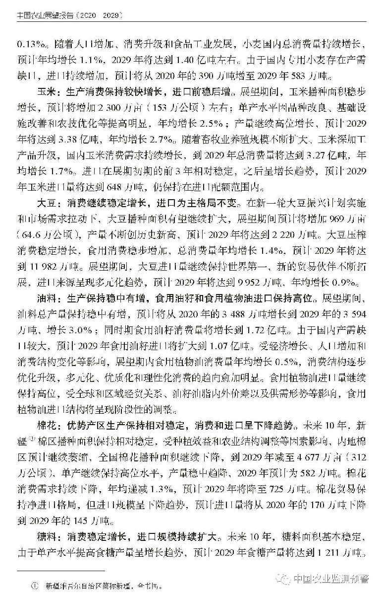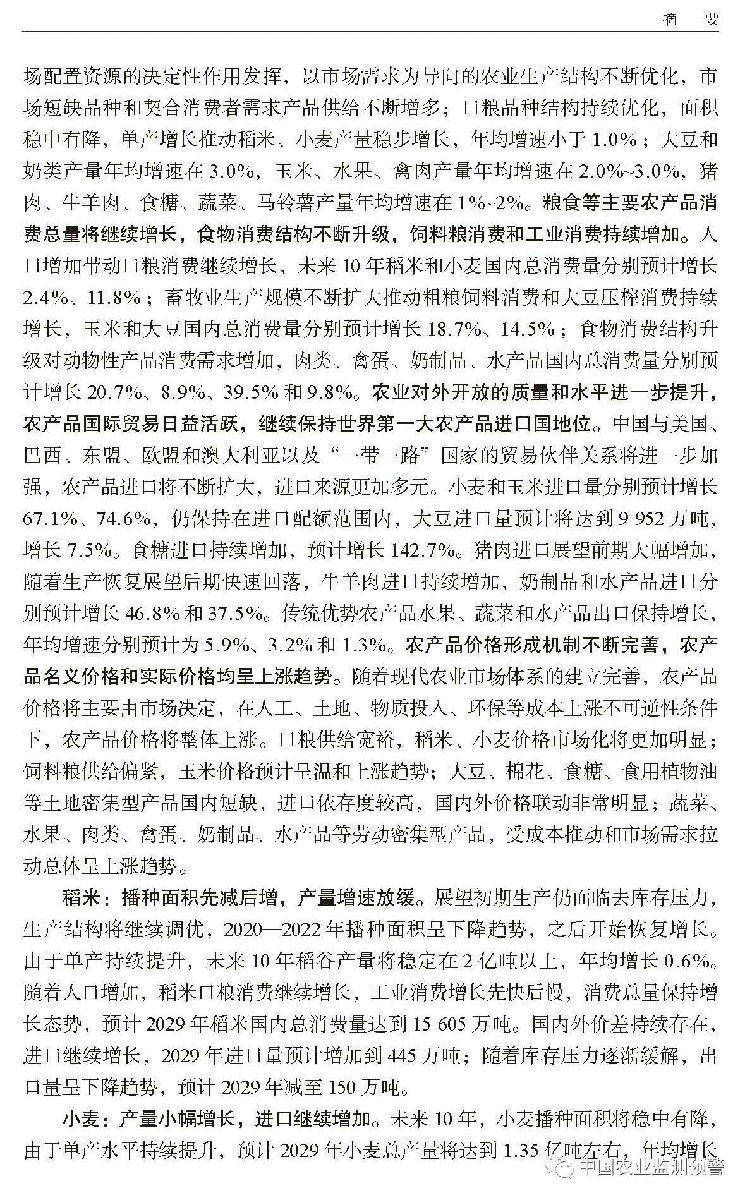 稻谷、小麥、玉米是中國三大谷物,《報告》顯示,未來10年,中國谷物生產(chǎn)平穩(wěn)向好,消費持續(xù)逐步提升,口糧供給充足。得益于科技進步、單產(chǎn)提高,稻谷產(chǎn)量將穩(wěn)定在2億噸以上,優(yōu)質(zhì)稻谷播種面積將增加,小麥產(chǎn)量將達到13500萬噸,玉米產(chǎn)量將達到3.38億噸。
