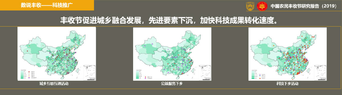 報告》指出各地舉辦中國農民豐收節(jié),活動形式和展示對象多種多樣,融合了傳統(tǒng)文化傳承、農事體驗、農產品展示、農業(yè)旅游等元素,在此基礎上,各地還組織了會議論壇、科技宣傳、推介簽約等新的活動,通過與新媒體平臺跨界合作,強化地方農產品品牌,促進農產品產銷對接;促使先進要素下沉,加快了科技成果轉化速度,整體推動城鄉(xiāng)融合發(fā)展。