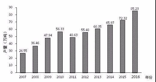 圖一 2007-2016年全國小龍蝦養(yǎng)殖產(chǎn)量變化情況