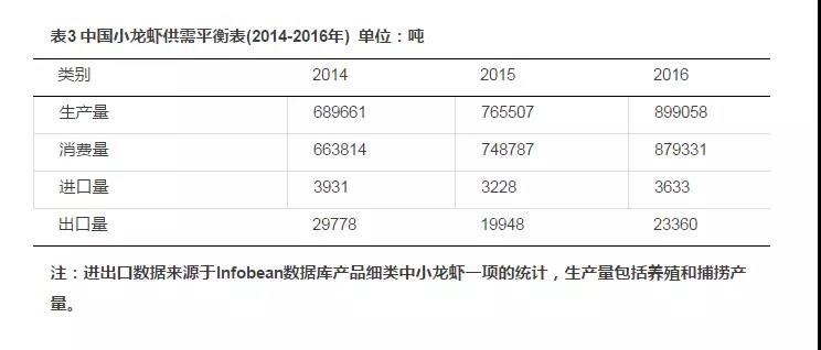 表3 中國小龍蝦供需平衡表(2014-2016年)單位:噸