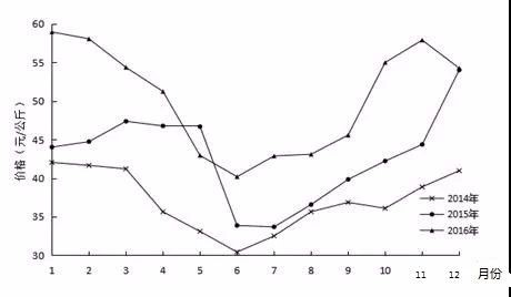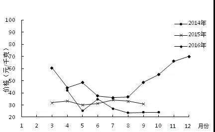 小龍蝦的生產(chǎn)供給季節(jié)性特征明顯,市場價格隨上市供給量變化而波動。根據(jù)2014-2016年小龍蝦批發(fā)價格和出塘價格看。近三年小龍蝦價格逐年提高,價格呈季節(jié)性波動,每年的6-7月上市旺季期間價格最低,春冬季上市淡季期間價格走向峰值。