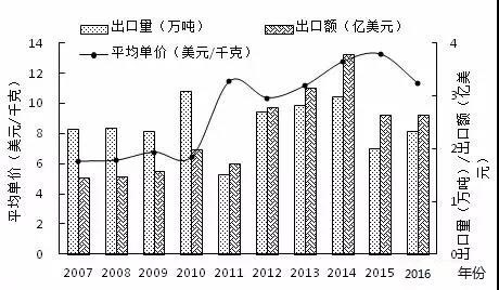 圖8 2007-2016年全國小龍蝦出口情況