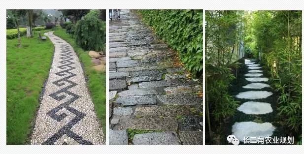 園區(qū)在保證交通流暢的前提下盡量減少了道路的用地面積。由于地形和功能上的約束,道路可作少量的迂回曲化,縱向坡度一般不大于8%,游憩步道特殊路段不大于12%;橫向坡度一般在1%-4%,呈兩面坡,利排水。同時(shí)考慮傷殘人士的使用,需設(shè)有盲人步道及殘疾人坡道。按道路的材質(zhì)分大體可分為卵石路,水泥路,石板路、透水磚路等。