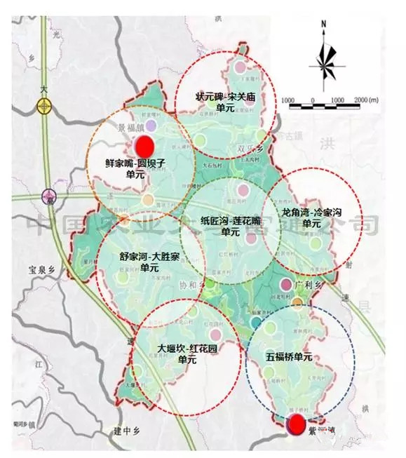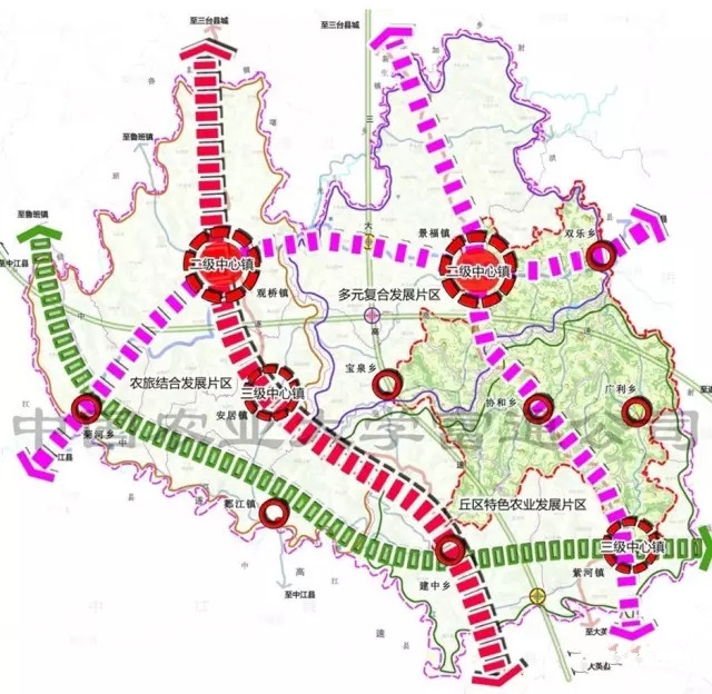 而中農(nóng)富通規(guī)劃設(shè)計(jì)的另一個(gè)項(xiàng)目“四川省綿陽市農(nóng)村綜合改革試驗(yàn)區(qū)”則是“一村一體”模式的農(nóng)業(yè)綜合體,其規(guī)劃定位為:產(chǎn)村一體互動(dòng)相融、丘區(qū)地域風(fēng)貌獨(dú)特的四川省丘區(qū)重點(diǎn)扶貧開發(fā)樣板區(qū)、四川省農(nóng)村綜合改革試驗(yàn)先行區(qū)、四川省丘區(qū)生態(tài)綠色農(nóng)業(yè)和幸福美麗新村示范點(diǎn)。采用“重點(diǎn)鄉(xiāng)鎮(zhèn)+示范園區(qū)“、”中心村+生產(chǎn)基地” 發(fā)展模式,近期優(yōu)先扶植培育多個(gè)現(xiàn)代農(nóng)業(yè)示范園,以園區(qū)引領(lǐng),村與規(guī)模產(chǎn)業(yè)組團(tuán)式發(fā)展,指狀伸展,實(shí)現(xiàn)產(chǎn)村一體的發(fā)展思路,快速推動(dòng)產(chǎn)業(yè)與村莊一體化發(fā)展格局。根據(jù)空間關(guān)系、產(chǎn)業(yè)規(guī)模、交通條件等因素整個(gè)核心區(qū)劃分7個(gè)產(chǎn)村單元。每個(gè)產(chǎn)村單元打造一種特色主導(dǎo)產(chǎn)業(yè),兼顧其他產(chǎn)業(yè)發(fā)展。