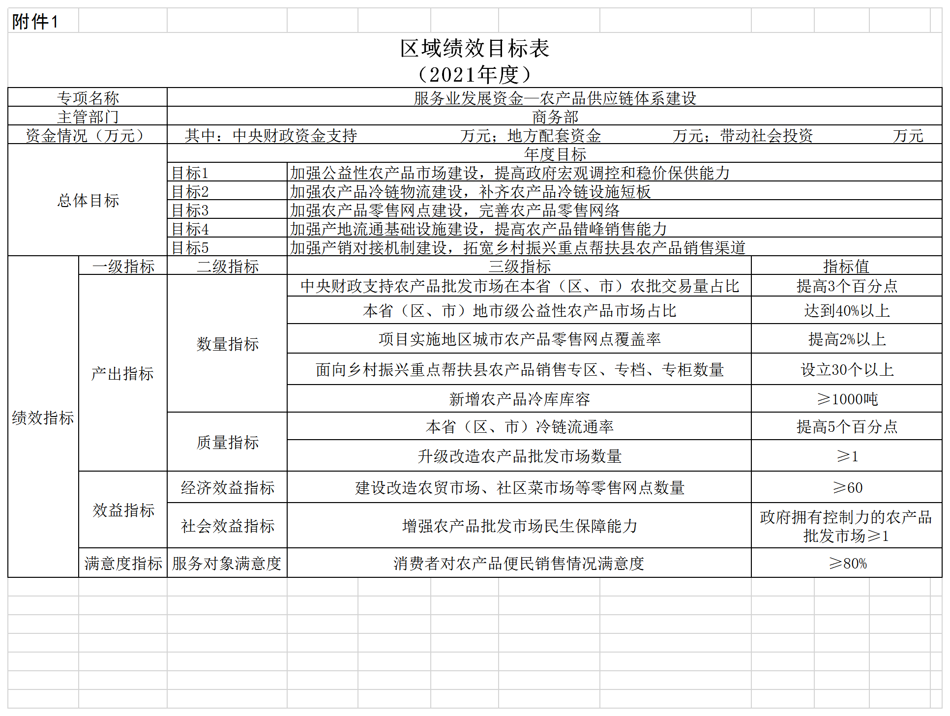(二)組織地方申報。有意愿省份(包括收到提前下達資金的省份)根據本通知要求,結合本地實際情況,制定實施方案,于5月20日前報商務部、財政部,申請中央財政資金支持。實施方案應按照2年工作周期進行編制,要思路清晰、重點突出、目標明確、措施有效、責任明晰、數字詳實,具體包括以下內容:一是本地區(qū)農產品供應鏈發(fā)展現狀,重點結合擬支持方向,提出需要著力補齊的短板和弱項。二是提出任務內容、資金支持方式和重點、資金管理、工作機構及保障措施等內容。三是按支持年度明確提出中央財政資金績效指標(參照附件1),根據支持內容,分類確定不同支持領域可量化的考核評價指標。四是其他需要上報符合實際需要的事項。