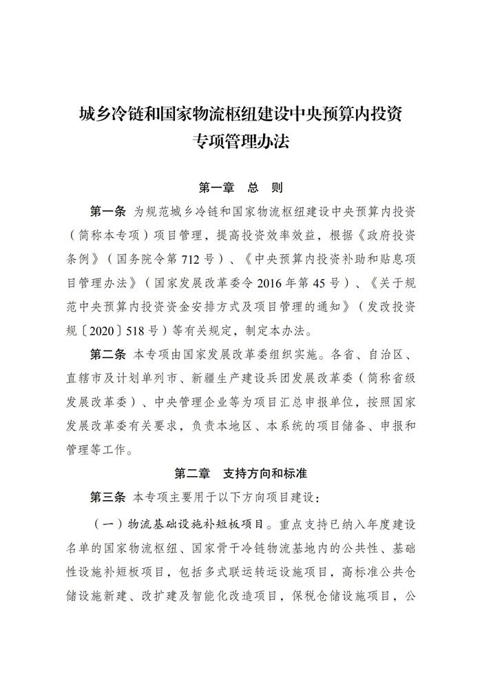 城鄉(xiāng)冷鏈和國(guó)家物流樞紐建設(shè)中央預(yù)算內(nèi)投資專項(xiàng)管理辦法