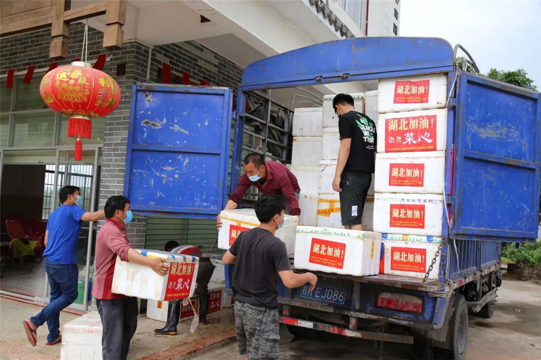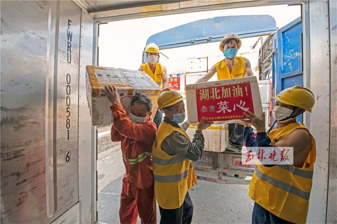 ▼3月9日上午,兩輛裝滿支援湖北果蔬的貨車從五彩田園中農(nóng)富玉基地發(fā)車,駛向玉林火車站“廣西(玉林市)支援湖北果蔬物資冷鏈專列”。車上載滿了廣西中農(nóng)富玉國際農(nóng)業(yè)科技有限公司(以下簡(jiǎn)稱中農(nóng)富玉)及中農(nóng)富玉聯(lián)合本地的愛心企業(yè)、合作社捐贈(zèng)的優(yōu)質(zhì)農(nóng)產(chǎn)品。