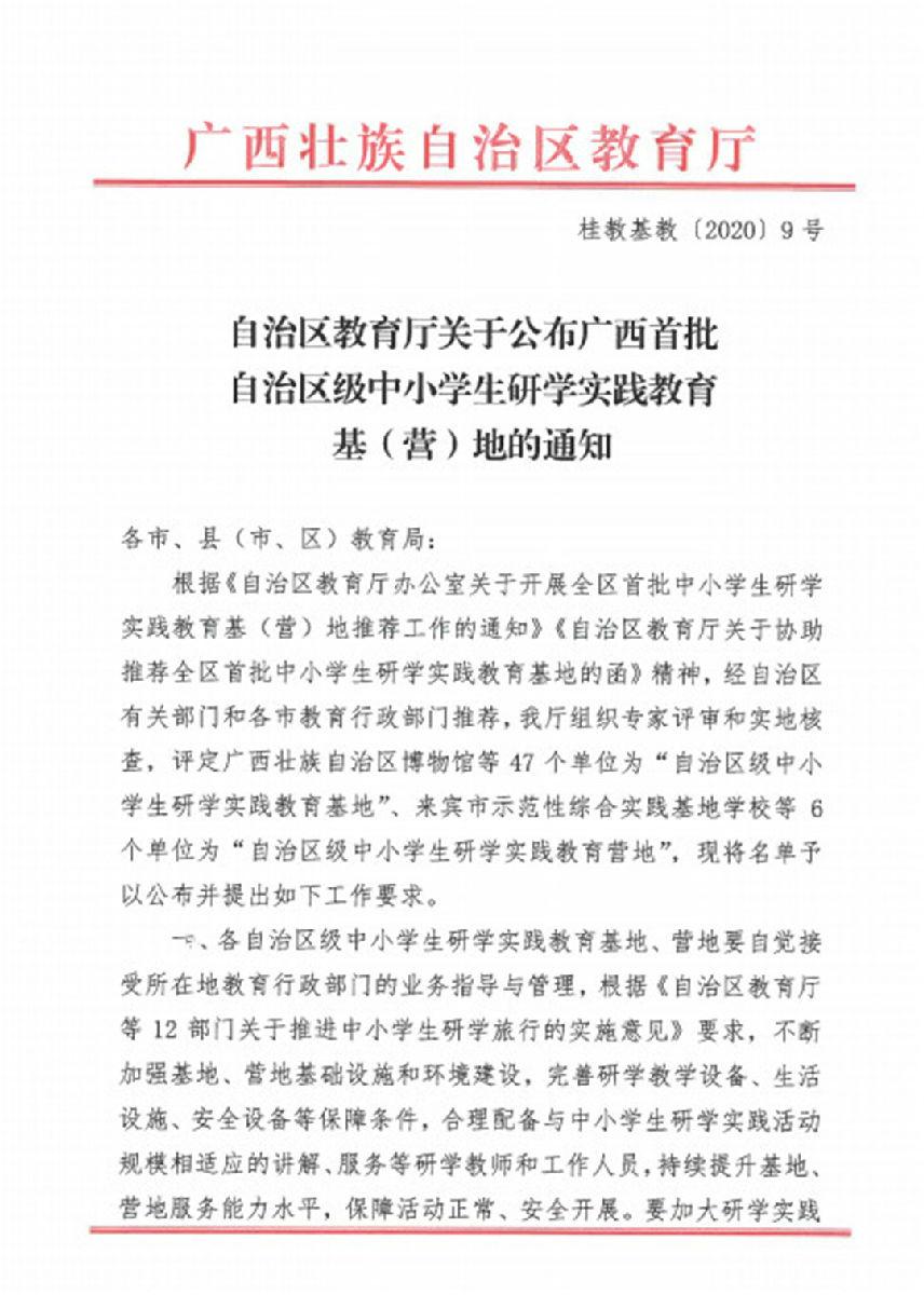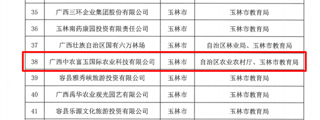 ▼2月11日,廣西壯族自治區(qū)教育廳發(fā)布了《自治區(qū)教育廳關(guān)于公布廣西首批自治區(qū)級(jí)中小學(xué)生研學(xué)實(shí)踐教育基(營(yíng))地的通知》(桂教基教[2020]9號(hào)),玉林市共有7個(gè)研學(xué)基地通過專家組的評(píng)審和實(shí)地考察,入選首批自治區(qū)級(jí)中小學(xué)生研學(xué)實(shí)踐教育基地!廣西中農(nóng)富玉國(guó)際農(nóng)業(yè)科技有限公司(以下簡(jiǎn)稱:中農(nóng)富玉)成功入選廣西首批“自治區(qū)級(jí)中小學(xué)生研學(xué)實(shí)踐教育基地”。