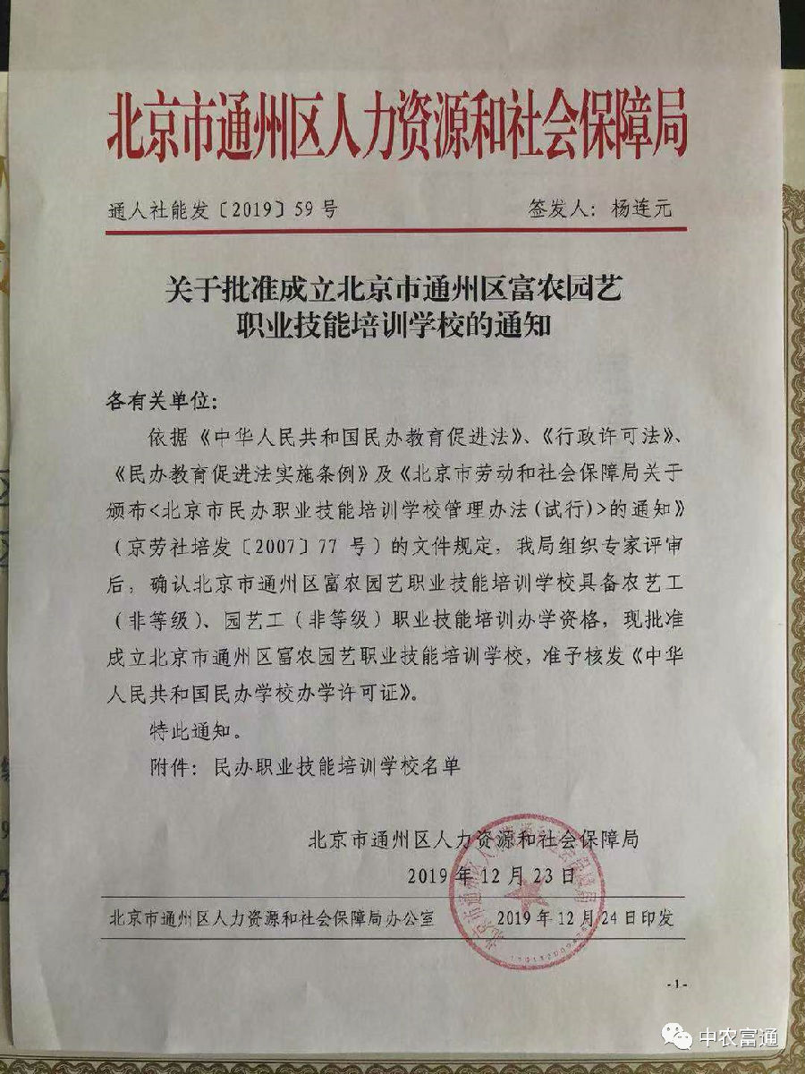 ▼近日,北京市通州區(qū)人力資源和社會(huì)保障局下發(fā)《關(guān)于批準(zhǔn)成立北京市通州區(qū)富農(nóng)園藝職業(yè)技能培訓(xùn)學(xué)校的通知》,富農(nóng)園藝職業(yè)技能培訓(xùn)學(xué)校辦學(xué)許可證正式獲批, 該學(xué)校由北京中農(nóng)富通園藝有限公司籌辦!