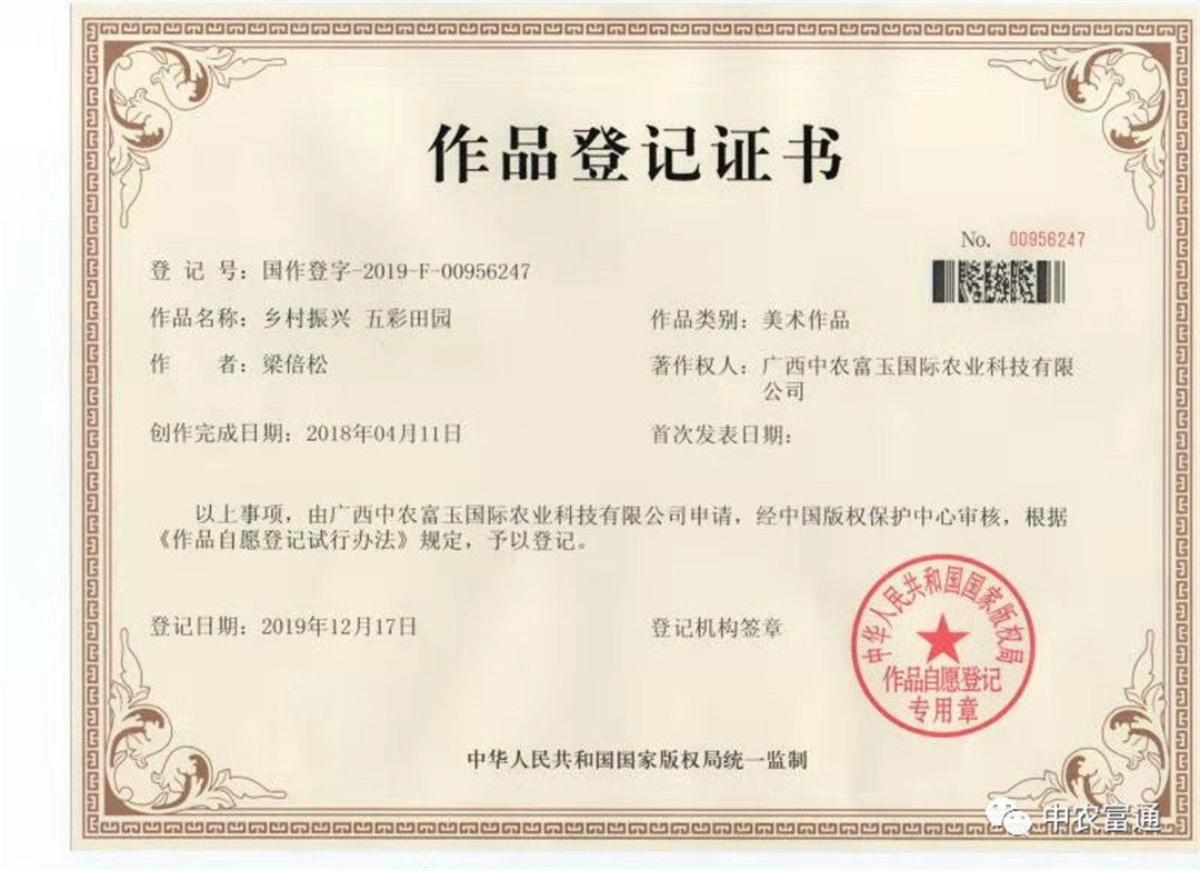 ▼近日,由廣西中農(nóng)富玉國(guó)際農(nóng)業(yè)科技有限公司申請(qǐng)的“鄉(xiāng)村振興 五彩田園”美術(shù)作品,經(jīng)中國(guó)版權(quán)保護(hù)中心審核,予以登記,并頒發(fā)作品登記證書。