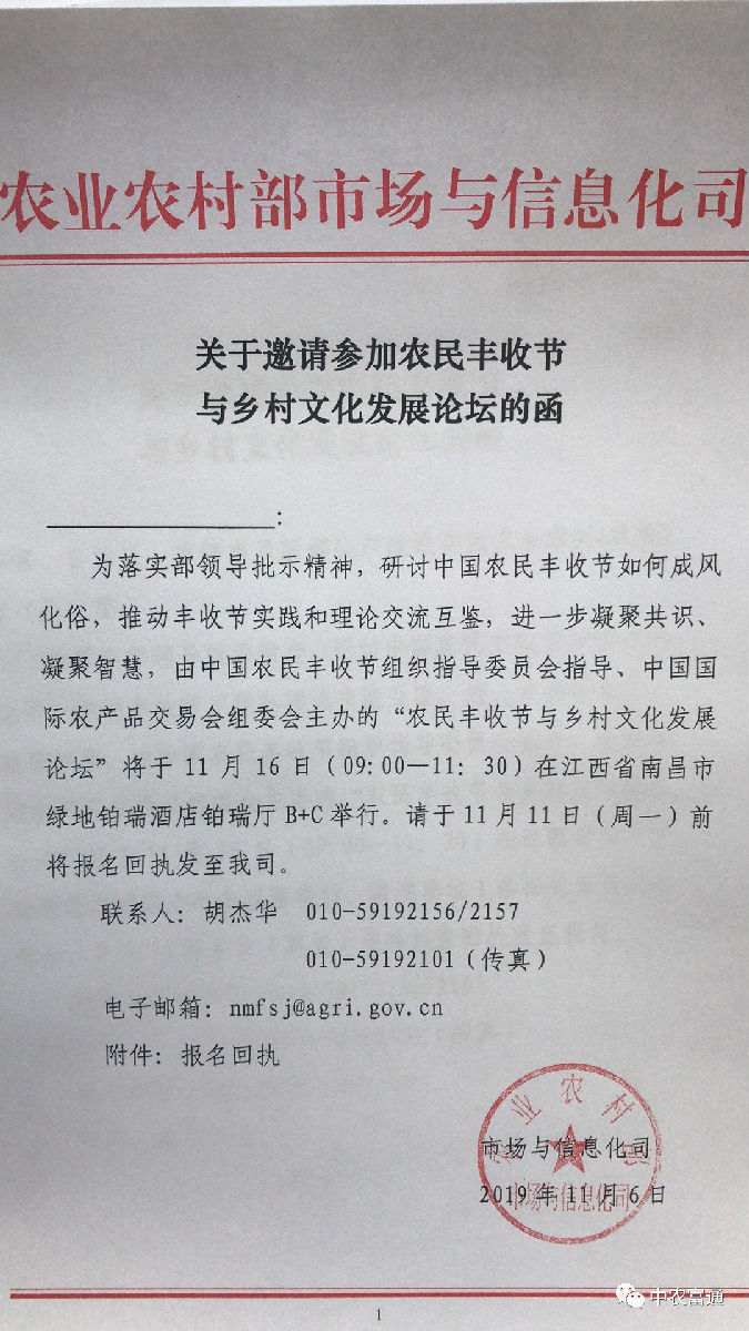 ▼由中國農(nóng)民豐收節(jié)組織指導(dǎo)委員會指導(dǎo),第十七屆中國國際農(nóng)產(chǎn)品交易會組委會主辦,江西省南昌市人民政府與中國農(nóng)業(yè)大學(xué)農(nóng)業(yè)規(guī)劃科學(xué)研究所承辦的“春華秋實話嘉年”農(nóng)民豐收節(jié)與鄉(xiāng)村文化發(fā)展論壇籌備工作進展順利,將于2019年11月16日 09:00-11:30在江西·南昌 綠地鉑瑞酒店鉑瑞廳B+C舉行,誠邀您的參加!