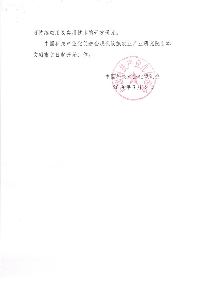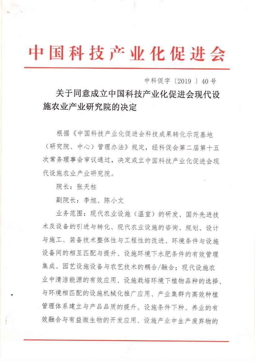 2019年8月9日,中國(guó)科技產(chǎn)業(yè)化促進(jìn)會(huì)公布了關(guān)于同意北京中農(nóng)富通園藝有限公司(簡(jiǎn)稱中農(nóng)富通)成立“中國(guó)科技產(chǎn)業(yè)化促進(jìn)會(huì)現(xiàn)代設(shè)施農(nóng)業(yè)產(chǎn)業(yè)研究院”的決定。任命中國(guó)農(nóng)業(yè)大學(xué)農(nóng)業(yè)規(guī)劃科學(xué)研究所所長(zhǎng)、設(shè)施農(nóng)業(yè)產(chǎn)業(yè)國(guó)際合作聯(lián)盟理事長(zhǎng)張?zhí)熘鶠檠芯吭涸洪L(zhǎng),任命中農(nóng)富通園區(qū)發(fā)展事業(yè)部總經(jīng)理李旭、技術(shù)創(chuàng)新事業(yè)部總經(jīng)理陳小文為副院長(zhǎng)。