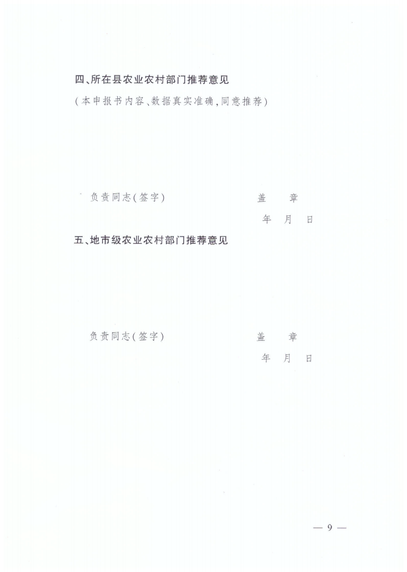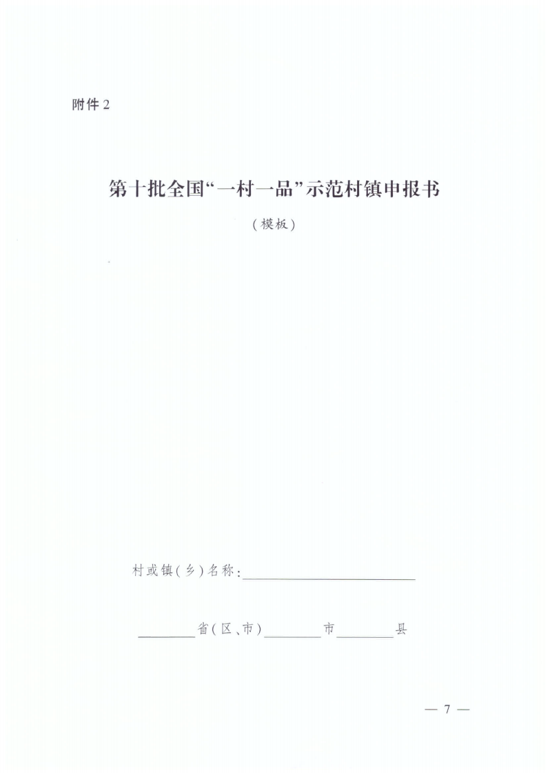 (一)村鎮(zhèn)申報。對照申報條件,填寫《第十批全國“一村一品”示范村鎮(zhèn)申報書》(見附件2),向縣級農(nóng)業(yè)農(nóng)村部門提出申請,并附有關(guān)證明材料。