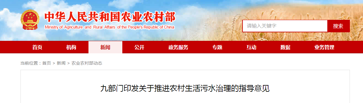 近日,中央農(nóng)辦、農(nóng)業(yè)農(nóng)村部、生態(tài)環(huán)境部、住房城鄉(xiāng)建設(shè)部、水利部、科技部、國家發(fā)展改革委、財政部、銀保監(jiān)會等九部門聯(lián)合印發(fā)了《關(guān)于推進農(nóng)村生活污水治理的指導意見》......