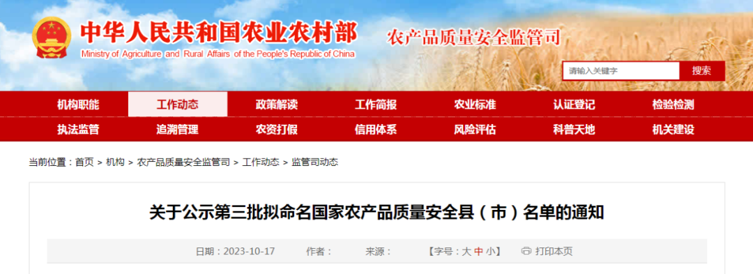按照《國家農(nóng)產(chǎn)品質(zhì)量安全縣創(chuàng)建活動(dòng)方案》和《國家農(nóng)產(chǎn)品質(zhì)量安全縣考核辦法》要求,農(nóng)業(yè)農(nóng)村部于2021年起組織開展第三批國家農(nóng)產(chǎn)品質(zhì)量安全縣(市)創(chuàng)建活動(dòng)?;顒?dòng)開......